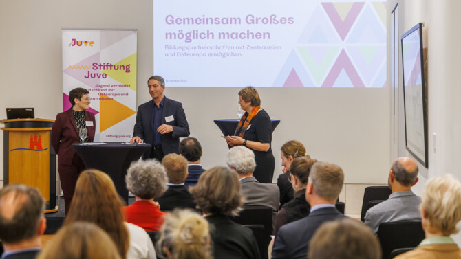 Am 14. Oktober 2025 luden die Gesellschafter der künftigen Stiftung Juve – Jugend verbindet Deutschland mit Osteuropa und Zentralasien zu einem besonderen Abend in die Landesvertretung der Freien und Hansestadt Hamburg in Berlin ein. Unter dem Titel „Gemeinsam Großes möglich machen“ kamen rund 30 Vertreterinnen und Vertreter aus Politik, Wirtschaft, Bildung und Zivilgesellschaft zusammen, um über die Zukunft internationaler Jugendbegegnungen mit Osteuropa und Zentralasien zu sprechen und Ideen für gemeinsame Wege der Unterstützung zu entwickeln.